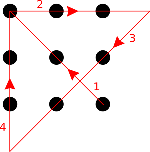 Une todos los puntos del siguiente dibujo, con cuatro líneas rectas y sin levantar el lápiz de la hoja: